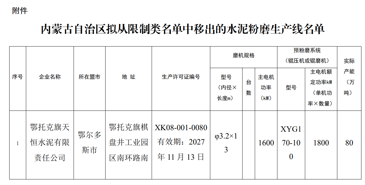 內蒙古自治區工信廳5月7日消息:根據《鄂爾多斯市工信局關于將鄂托克旗天恒水泥有限責任公司水泥粉磨線調出限制類名單的請示》(鄂工信科字〔2024〕82號),鄂托克旗天恒水泥有限責任公司(以下簡稱:天恒水泥公司)原有一臺φ3.2×13m水泥磨機,主電機功率1600KW。在自治區工信廳已公告的限制類水泥粉磨生產線名單中,核定產能為40萬噸/年。