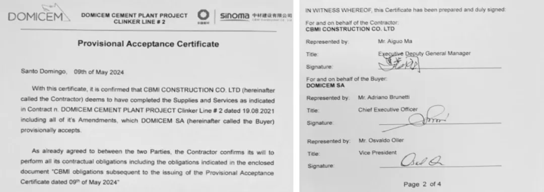 2024年5月9日,多米尼加二期3500TPD熟料線項目獲得業主頒發的PAC證書。PAC證書的頒發標志著項目EPC合同履約順利結束,生產線至此正式移交業主,進入質保階段。