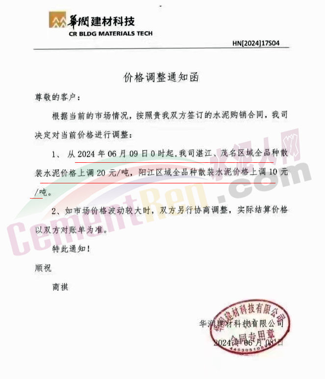 日前,華南主要品牌企業(yè)華潤(rùn)建材科技有限公司通知,從2024年6月9日0時(shí)起,湛江、茂名區(qū)域全品種散裝水泥價(jià)格上調(diào)20元/噸,陽(yáng)江區(qū)域全品種散裝水泥價(jià)格上調(diào)10元/噸。這是新國(guó)標(biāo)實(shí)施后廣東第一波上漲,同期,廣西區(qū)域興業(yè)紅獅、北流寶路等多家品牌企業(yè)通知上調(diào)粵西區(qū)域水泥報(bào)價(jià)。