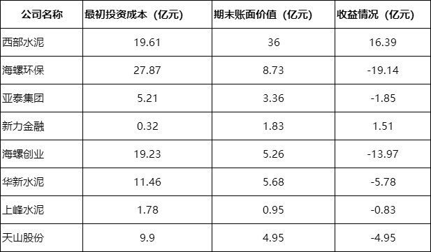 從投資的企業(yè)來看,僅西部水泥和新力金融屬于正收益,總收益17.9億元,而投資的海螺環(huán)保、亞泰集團(tuán)、海螺創(chuàng)業(yè)、華新水泥、上峰水泥、天山股份累計(jì)虧損46.52億元。