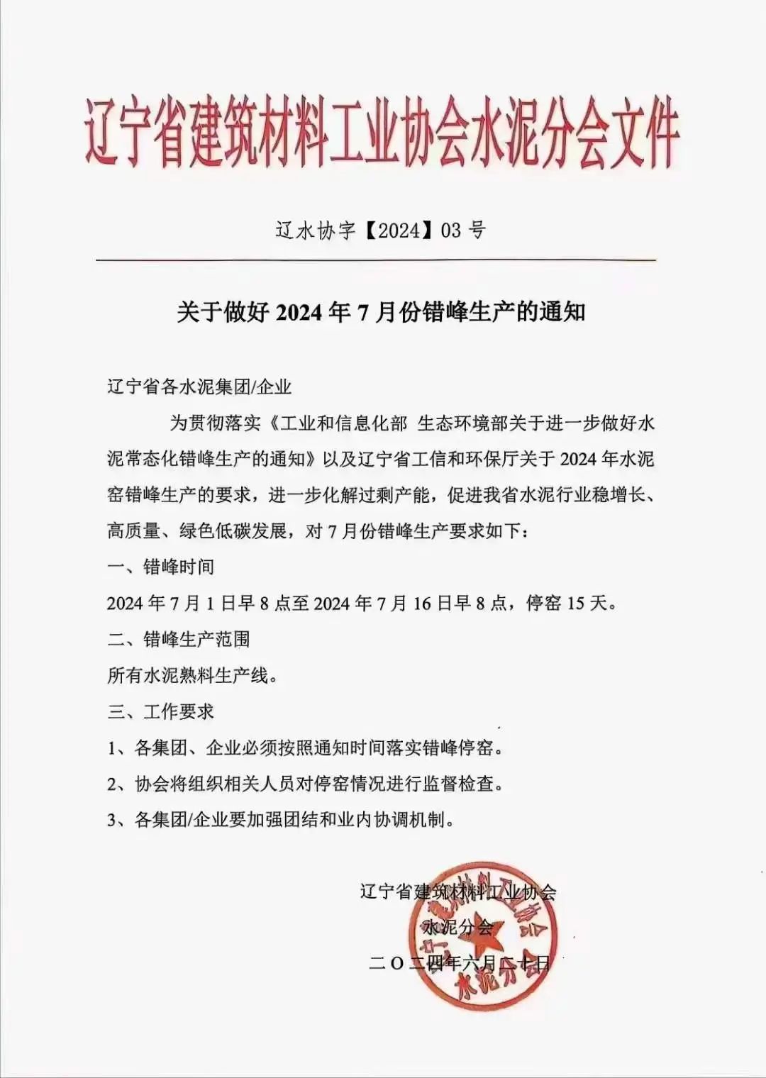 遼寧省建材工業(yè)協(xié)會水泥分會發(fā)布《關(guān)于做好2024年7月錯峰生產(chǎn)的通知》稱:遼寧省所有水泥熟料生產(chǎn)線自2024年7月1日早8點(diǎn)至2024年7月16日早8點(diǎn),停窯15天。