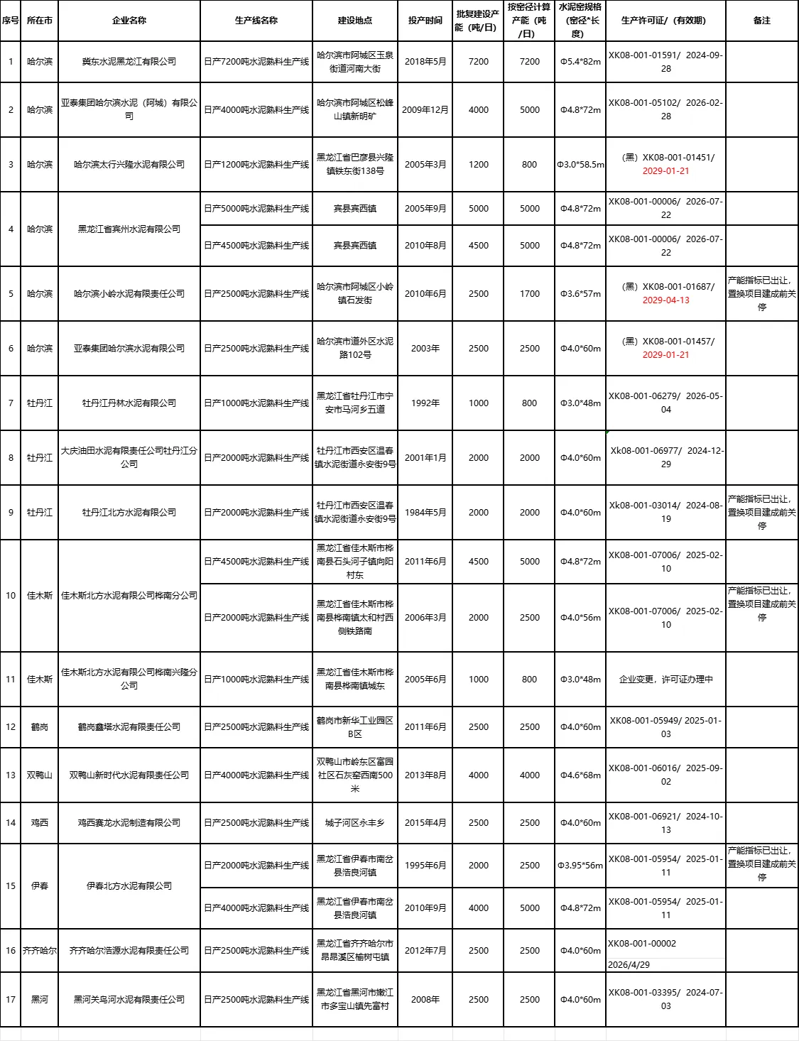 根據(jù)黑龍江省工信廳發(fā)布的《黑龍江省水泥熟料生產(chǎn)線清單》,截至到2023年12月31日,黑龍江省共有17家水泥廠20條水泥熟料生產(chǎn)線,其中4條水泥熟料生產(chǎn)線已經(jīng)進(jìn)行了產(chǎn)能置換,在置換項目建成前關(guān)停。