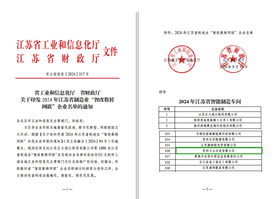 近日,江蘇省工業(yè)和信息化廳公布了2024年智能制造和數字化車間名單,蘇州天山水泥有限公司(以下簡稱“天山水泥”榜上有名,榮獲江蘇省“智能制造車間”稱號。