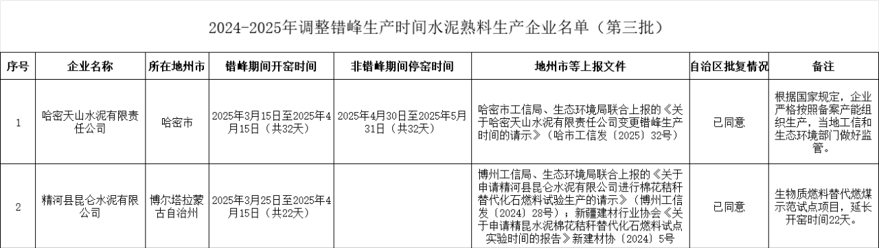 3月12日,新疆自治區(qū)工信廳發(fā)布第三批關(guān)于2024-2025年新疆水泥企業(yè)調(diào)整錯峰生產(chǎn)時間的公告稱,按照通知要求,哈密天山水泥有限責(zé)任公司因區(qū)域市場供需關(guān)系變化申請變更錯峰開窯時間;精河縣昆侖水泥有限公司因?qū)嵤┥镔|(zhì)燃料替代燃煤示范試點項目申請延長錯峰開窯時間。