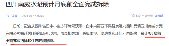 根據四川省生態環境保護督察工作領導小組辦公室2021年3月11日發布的關于【《四川省落實中央第五環境保護督察組督察反饋意見整改方案》第七十六項整改任務完成整改銷號的公告】顯示,截至2021年3月10日,南威水泥已按時完成現有生產線關閉,達到環境保護整改銷號要求。