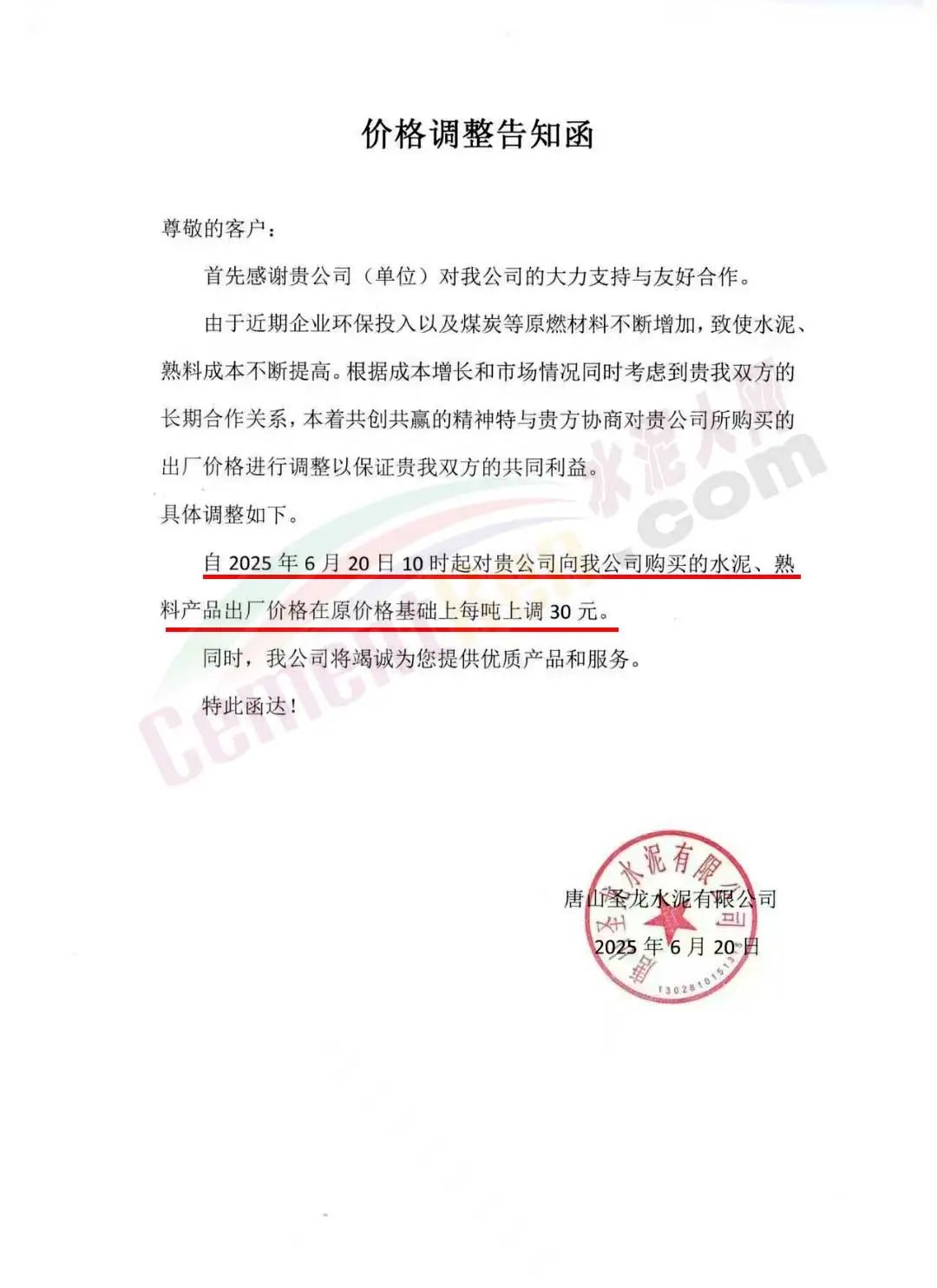 唐山圣龍水泥有限公司通知,6月20日10時起,水泥、熟料產(chǎn)品出廠價格在原價基礎(chǔ)上上調(diào)30元/噸。