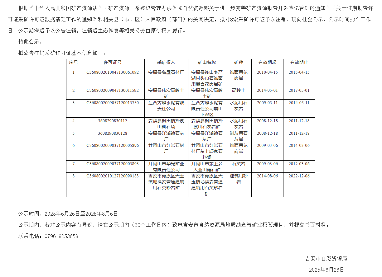 同期吉安市自然資源局發布關于擬公告注銷8宗采礦許可證的公示稱,擬對8宗采礦許可證予以注銷。